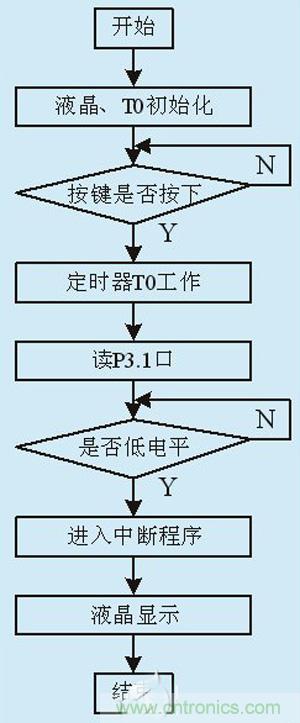 系統(tǒng)軟件環(huán)境以Keil4.0為仿真平臺,使用C語言編程編寫了運行程序;包括主程序模塊、顯示模塊和電容測試模塊。軟件設計主要包括三個方面:一是初始化系統(tǒng);二是按鍵檢測;三是數(shù)據(jù)采集、數(shù)據(jù)處理并進行顯示。程序采用模塊化的結(jié)構,這樣便于調(diào)試和修改,易編程和易讀性好,也程序結(jié)構清楚。系統(tǒng)程序流程如圖6所示,首先對P3.5口脈沖信號頻率的測量,再通過(5)式算出所測的電容值,由LCD1602顯示出來。