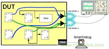 -現場探頭:允許采用兩個專用探頭,經配置用于觀察邏輯元件中任何輸入或輸出的探測點(圖1)。然后,探頭數據可發(fā)送到示波器或甚至重新引導回到FPGA結構,驅動內部邏輯分析儀。這些探測點是實時動態(tài)的。探測點可以通過軟件在運行中更改,不需要把FPGA重新編譯或重新編程。