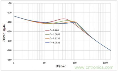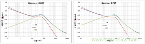 圖2所示為伽馬對(duì)相位噪聲的影響。回路帶寬和相位邊限相同,而伽馬值不同。伽馬值越高,由于噪聲整形回路濾波器平緩度提升,VCO的提升斜率也會(huì)變低。