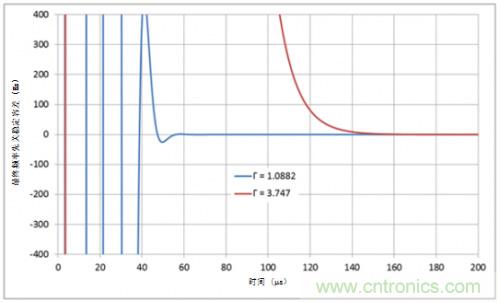 但較高的伽馬值也有其蔽處:鎖定時(shí)間更長(zhǎng)。圖4所示為不同伽馬值下200MHz頻率躍變的鎖定時(shí)間;回路帶寬和相位邊限保持不變。當(dāng)伽馬值和回路帶寬分別為1和3.7,穩(wěn)定容差在±100Hz范圍內(nèi),模擬鎖定時(shí)間值分別為46.5µs與118µs。