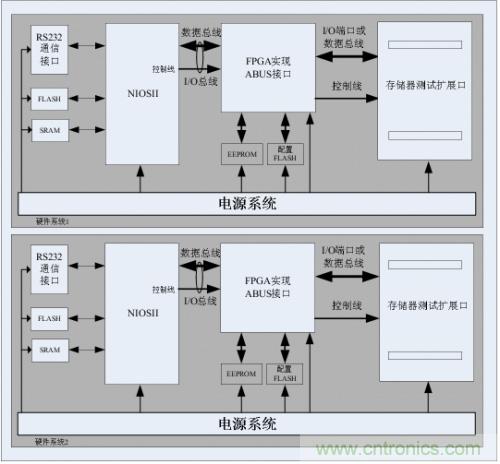 在測試NAND FLASH時(shí),測試時(shí)間長達(dá)十個(gè)小時(shí)不等。在此為提高測試效率,增加測試速度,本設(shè)計(jì)采用兩套完全一樣且獨(dú)立的硬件系統(tǒng)構(gòu)成。可同時(shí)最多測試2片NAND FLASH器件。每一個(gè)硬件系統(tǒng)由一個(gè)微處理器(NIOSII)加一個(gè)大容量FPGA及一個(gè)存儲(chǔ)器測試擴(kuò)展接口(即ABUS接口)三大模塊構(gòu)成。如圖3-1。RS232通信接口實(shí)現(xiàn)測試系統(tǒng)與上位機(jī)的數(shù)據(jù)交換,完成人機(jī)交互操作。電源系統(tǒng)產(chǎn)生各種合適的電壓,滿足各芯片的電源供給。
