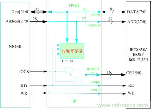 如圖4-3,SRAM、MRAM和NOR FLASH的接口操作基本一致,NIOSII的總線時(shí)序完全滿足。故在FPGA內(nèi)部只要簡單的把相應(yīng)的控制線和數(shù)據(jù)線相連就可以了,唯獨(dú)只要設(shè)計(jì)一個(gè)片選寄存器,用來區(qū)分SIP的16個(gè)片選。每一個(gè)片選可以訪問的空間為128MByte。片選寄存器的地址為(基址+0x0FFFFFFC),基地睛設(shè)在NIOSII 外部總線的最高地址位。