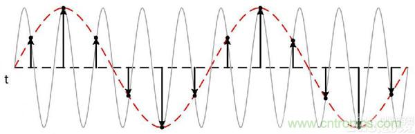 當采樣過程不滿足Nyquist(奈奎斯特)采樣定理,就可以考慮使用另一種采集方法--等效采樣。等效采樣的基本原理是把高頻、快速信號變成低頻、慢速重復信號進行采集。為了達到低速采樣還原高頻信號的目的,要求被測信號一定是周期變化的,如果將每個采樣點安排在不同信號周期內(nèi),取自波形不同的位置上,而不是在同一個周期的話,就可以大大降低采樣頻率。最后通過數(shù)學方法再將多個周期內(nèi)的采樣點還原到一個周期內(nèi),重構(gòu)被測信號。