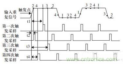 等效采樣有可以分為順序等效采樣和隨機等效采樣。順序等效采樣是在間隔K個周期捕獲一個樣值,每經(jīng)過k個周期再經(jīng)過一個微小的延時△t就獲得一個樣值。假設(shè)k=1時,每周期采樣N個點的等效采樣和重構(gòu)過程。最后將采集的數(shù)據(jù)拼湊到一個周期內(nèi),實現(xiàn)對原始輸入信號波形的重構(gòu)。重構(gòu)后的采樣頻率變?yōu)槲⑿⊙訒r△t的倒數(shù)。通過控制這個△t的大小,就可以控制等效采樣的頻率。實際采樣頻率可以通過控制K的大小進行調(diào)節(jié)。K越大,實際采樣頻率越小;而△t越小,等效采樣頻率越高。這樣就實現(xiàn)了低速采樣高頻信號的目的。