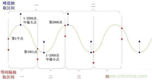峰值抽取是采樣點有 2M,顯示點數(shù) 2k,實際顯示是 2k 個點抽取兩個,0~2000 點之間找最大和最小值,然后是 2001~4000 之間找最大和最小值,以此類推,重新構(gòu)建波形。如下圖: