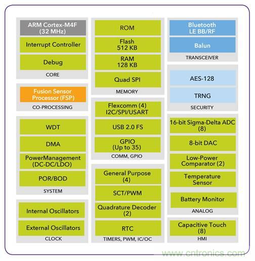 圖3,NXP最新推出的支持BLE的無線MCU QN908x,內(nèi)置優(yōu)化的FSP硬件協(xié)處理器