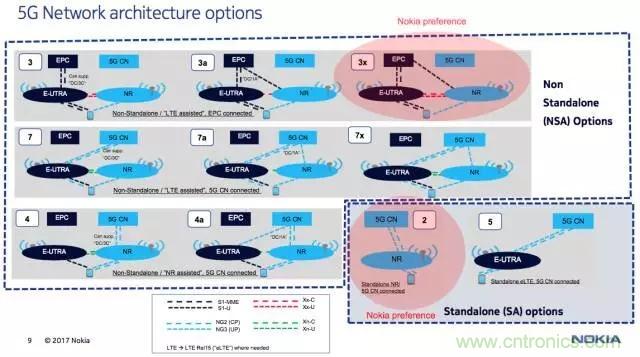 對于5G組網(wǎng),3GPP在去年釜山會議上由德國電信提出了12種組網(wǎng)選項。其中選項3/3a/3x、7/7a/7x、4/4a為非獨立組網(wǎng)構(gòu)架,選項2、5為獨立組網(wǎng)構(gòu)架。