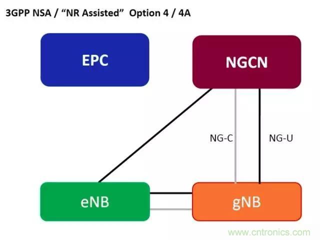 2)4G基站(eNB)和5G基站(gNB)共用5G核心網(wǎng)(NGCN),eNB仍然為主站,gNB為從站,控制面信令走4G基站至5G核心網(wǎng)。