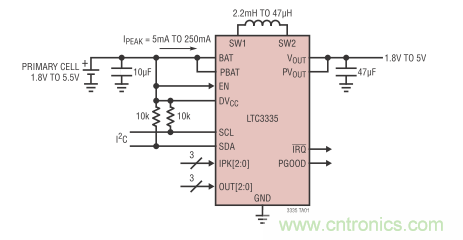 LTC3335 是一款毫微功率高效率同步降壓-升壓型轉(zhuǎn)換器,內(nèi)置了精確的庫倫計(jì)數(shù)器,提供高達(dá) 50mA 連續(xù)輸出電流。該器件具僅為 680nA 的靜態(tài)電流,可編程峰值輸入電流從低至 5mA 直至 250mA,非常適合多種低功率電池應(yīng)用,例如在可穿戴設(shè)備和 IoT 設(shè)備中見到的那些應(yīng)用。其 1.8V 至 5.5V 輸入電壓范圍和 8 個(gè) 1.8V 至 5V 的用戶可選輸出允許在輸入電壓高于、低于或等于輸出電壓時(shí),提供穩(wěn)定的輸出電源。此外,該器件集成的精確 (±5% 電池放電測(cè)量準(zhǔn)確度) 庫倫計(jì)數(shù)器可在長壽命不可再充電的電池供電應(yīng)用中,對(duì)累積電池放電提供準(zhǔn)確監(jiān)視,這類應(yīng)用在很多情況下具極其平坦的電池放電曲線。典型應(yīng)用包括無線傳感器、遠(yuǎn)程監(jiān)視器和ADI的 Dust Networks SmartMesh系統(tǒng)。LTC3335 包含 4 個(gè)內(nèi)部低 RDSON MOSFET,可提供高達(dá) 90% 的效率。其他特點(diǎn)包括一個(gè)可編程放電報(bào)警門限、一個(gè)用于存取庫倫計(jì)數(shù)值和器件設(shè)定的 I2C 接口、一個(gè)電源良好輸出和 8 個(gè) 5mA 至 250mA 的可選峰值輸入電流以適合多種類型和尺寸的電池。采用耐熱增強(qiáng)型 20 引線 3mm x 4mm QFN 封裝的 LTC3335 的工作結(jié)溫范圍為 -40°C 至 +125°C。圖 2 顯示了 LTC3335 的典型應(yīng)用電路。
