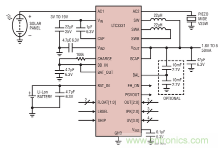 LTC3331 是一款完整的能量收集解決方案,提供高達(dá) 50mA 連續(xù)輸出電流,當(dāng)可收集能量可用時(shí)能延長電池壽命。簡(jiǎn)便的 10mA 分流器用收集的能量給可充電電池充電,同時(shí)低電池電量斷接功能保護(hù)電池免于深度放電。當(dāng)用收集的能量向負(fù)載提供穩(wěn)定功率時(shí),該器件僅需要電池提供 200nA 電源電流,當(dāng)在無負(fù)載情況下由電池供電時(shí),僅需要 950nA 工作電流。LTC3331 集成了一個(gè)高壓能量收集電源、一個(gè)電池充電器和一個(gè)同步降壓-升壓型 DC/DC 轉(zhuǎn)換器,可為能量收集應(yīng)用提供一個(gè)持續(xù)穩(wěn)定的輸出,例如無線傳感器網(wǎng)絡(luò)中的能量收集應(yīng)用。能量收集電源由適合 AC 或 DC 輸入的全波橋式整流器和高效率降壓型轉(zhuǎn)換器組成,從壓電 (AC)、太陽能 (DC)、或磁性 (AC) 能源收集能量。當(dāng)沒有收集能量可用時(shí),可充電電池輸入給降壓-升壓型轉(zhuǎn)換器供電,該轉(zhuǎn)換器在直至 4.2V 的整個(gè)電池電壓范圍內(nèi)運(yùn)行,無論輸入高于、低于或等于輸出,都可調(diào)節(jié)輸出。當(dāng)收集能源不再可用時(shí),LTC3331 自動(dòng)轉(zhuǎn)換至電池。LTC3331 的能量收集輸入在 3V 至 19V AC 或 DC 電壓范圍內(nèi)運(yùn)行,從而使該器件非常適合多種壓電、太陽能或磁性能源。其輸入欠壓閉鎖門限設(shè)定是可編程的,范圍為 3V 至 18V,從而使應(yīng)用能夠在峰值功率傳送點(diǎn)上運(yùn)行能量收集電源。其他特點(diǎn)包括引腳可編程輸出電壓和降壓-升壓峰值電流限制、一個(gè)超級(jí)電容器平衡器和一個(gè)輸入保護(hù)性分路器。LTC3331 采用耐熱增強(qiáng)型 5mm x 5mm QFN 封裝。圖 3 顯示了 LTC3331 的典型應(yīng)用電路。