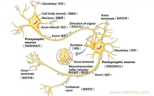 人腦神經(jīng)元在接受到刺激后,其細(xì)胞膜內(nèi)外帶電離子分布將發(fā)生變化,因而形成電位差,電位差將沿著神經(jīng)細(xì)胞軸突、樹突雙向傳導(dǎo),形成脈沖電流。而當(dāng)該電信號(hào)傳遞到突觸時(shí),突觸前神經(jīng)元將釋放神經(jīng)遞質(zhì)(如多巴胺、腎上腺素)由突觸后神經(jīng)元接受神經(jīng)遞質(zhì)產(chǎn)生興奮(該過程單向傳遞),并向下傳遞作用與人體反應(yīng)器并發(fā)生反應(yīng)。