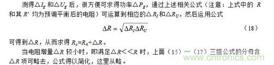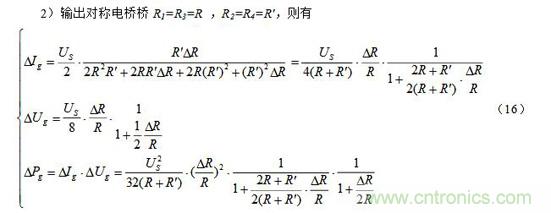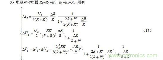 注意:上面(7)~(9)式中的R和其R′ 均為預(yù)調(diào)平衡后的電阻。此外,當電阻增量△R較小時,即滿足△R《《R時,上面(7)~(9)三式的分母中含△R項可略去,公式可得以簡化,這里從略。