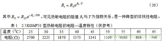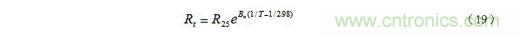 其中R25和Rt分別為25℃和t℃時熱敏電阻的阻值,T = 273 + t;Bn為材料常數(shù),其值因制作時不同的處理方法而異,對確定的熱敏電阻,可以由實驗測得的電阻—溫度曲線求得。我們也可以把(19)式寫成比較簡單的表達式