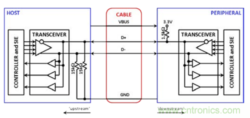 2. 它必須管理USB電纜上的雙向通信,確保其收發(fā)器在適當?shù)臅r候進行發(fā)送和接收,并精確重現(xiàn)所有驅(qū)動和空閑狀態(tài)。若要精確重現(xiàn)空閑狀態(tài),它必須在其上游側(cè)配置上拉電阻,以模擬連接下游外設(shè)的上拉電阻狀態(tài)。它在下游側(cè)也需配置下拉電阻。必須監(jiān)控總線上表示總線空閑、分組開始和分組結(jié)束的信號,以便正確響應(yīng)這些狀況。