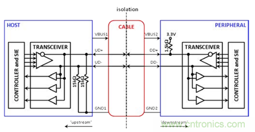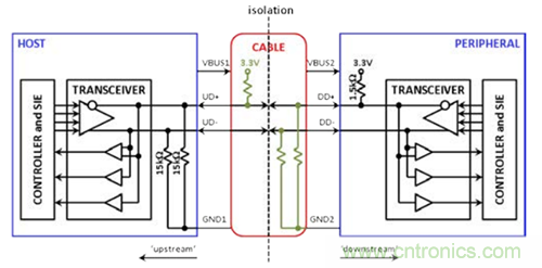 一種可能的隔離方法如圖2a所示。圖中,虛線表示隔離在理論上將USB電纜分割。D+和D–的狀態(tài)信息可以跨越隔離柵,但電流不能。GND1節(jié)點(上游的接地基準)現(xiàn)在與GND2節(jié)點(下游的接地基準)相互分離。不幸的是,隔離使主機無法“看到”下游的上拉電阻,而外設(shè)無法“看到”上游的下拉電阻。因此,需要使用一些額外的電阻,如圖2b所示,以便跨越隔離模仿相應(yīng)連接。在這個“透明”概念中,主機與外設(shè)之間的通信方式和圖1中的非隔離式連接十分類似。透明的USB隔離器元件可方便地插入收發(fā)器和USB電纜之間,并使用隔離電源。原本設(shè)計用于非隔離式應(yīng)用的主機和外設(shè)可方便地連接USB隔離器并交換標準USB信號,無需大幅改動設(shè)計。