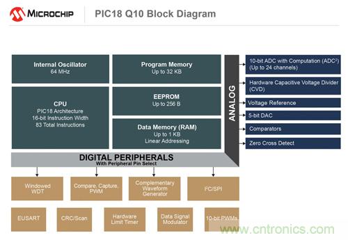 工具和遙控器)進(jìn)行了優(yōu)化。 該系列器件不僅集成了高速模數(shù)轉(zhuǎn)換器(ADC),提高模擬信號(hào)轉(zhuǎn)換速度從而產(chǎn)生確定性系統(tǒng)響應(yīng),還提高了振蕩器精度,使設(shè)計(jì)師能夠減少外部元件并節(jié)省成本。 PIC18 Q10系列的CIP包括互補(bǔ)波形發(fā)生器 (CWG)外設(shè),可簡(jiǎn)化復(fù)雜的開(kāi)關(guān)設(shè)計(jì);帶計(jì)算功能的模數(shù)轉(zhuǎn)換器 (ADC2),可在硬件中執(zhí)行高級(jí)計(jì)算和數(shù)據(jù)過(guò)濾,完全無(wú)需內(nèi)核干預(yù)。 此類CIP讓CPU能夠執(zhí)行人機(jī)接口 (HMI) 控制等更復(fù)雜的任務(wù),并在無(wú)處理需求時(shí)保持低功能模式,實(shí)現(xiàn)節(jié)能。