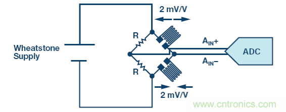 應(yīng)變計(jì)的靈敏度通常為 2 mV/V。惠斯登電源越高,靈敏度也就越高。為了增加應(yīng)變計(jì)的動態(tài)范圍并最大化 SNR,電橋可能采用比 ADC 更高的電源供電。