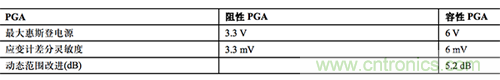 表 1. 惠斯登電橋中的阻性 PGA 和容性 PGA 對比(假設(shè)使用標(biāo)準(zhǔn)電源和增益)