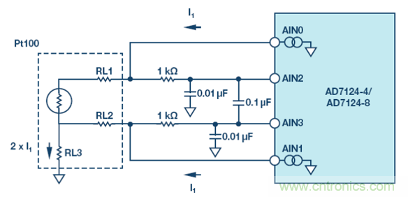 測量溫度并消除引線誤差的傳統(tǒng)方法如圖 10 所示。本例中,集成 PGA 的 Σ-Δ 型 ADC AD7124-8 的內(nèi)部電流源以相同電流驅(qū)動雙線式 RTD,在兩個(gè)引線上產(chǎn)生相同的失調(diào)誤差,其值與引線電阻成正比。