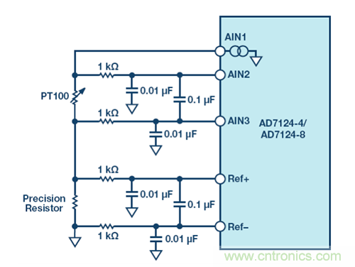 為了增加溫度測量的精度,建議采用四線式測量。本例中,只使用了一個(gè)電流基準(zhǔn)。為了避免電流源的不精確性,可以將精密電阻用作 ADC 基準(zhǔn)電壓發(fā)生器來進(jìn)行比例測量,如圖 11 示。