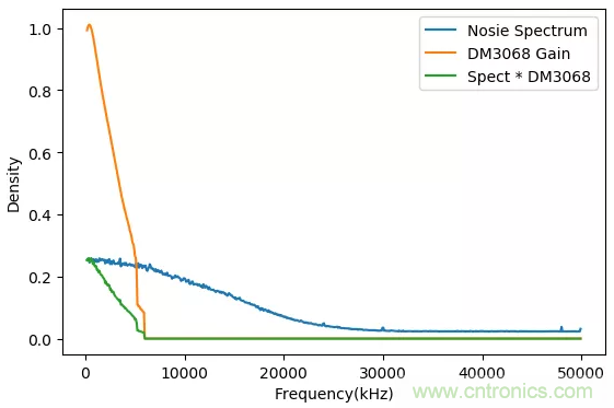 隨機信號頻譜(藍(lán)色),DM 3068頻譜特性(黃色),實際測量隨機噪聲各頻率分量的數(shù)值(綠色)
