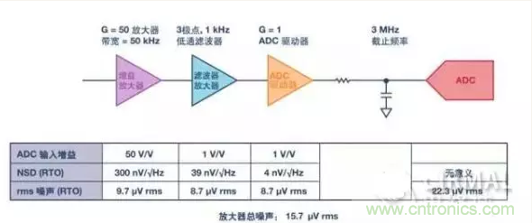 圖1顯示了過(guò)采樣系統(tǒng)中的情況。從噪聲頻譜密度看,系統(tǒng)總噪聲似乎以增益放大器為主,但一旦考慮帶寬,各級(jí)貢獻(xiàn)的rms噪聲其實(shí)非常相近。