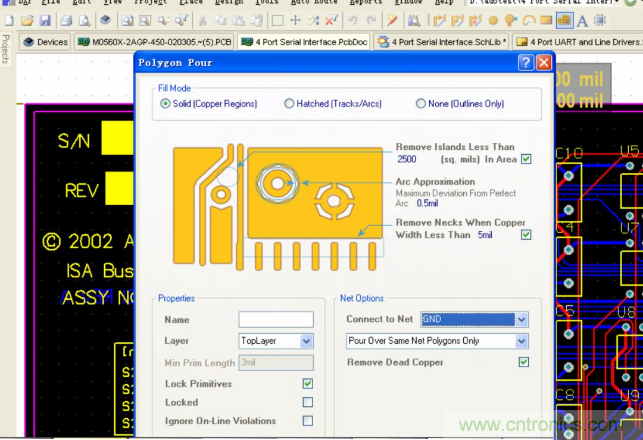 我們通過菜單上的快捷鍵來進行鋪銅操作,可以選擇實心鋪銅或網(wǎng)格鋪銅的模式,然后在 Net options下的 Connect to Net 選擇連接到合適的網(wǎng)絡(luò),一般連接到 GND網(wǎng)絡(luò),同時一般可以選中下面的移除死銅菜單。然后在合適的區(qū)域內(nèi)進行鋪銅的操作。