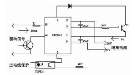 EXB84 系列為日本富士公司推出的IGBT專(zhuān)用芯片,能驅(qū)動(dòng)高達(dá)300A/1200V 的IGBT。它具有隔離強(qiáng)度高、反應(yīng)速度快、參數(shù)一致性好、具有防擎住效應(yīng)的緩關(guān)斷電路等優(yōu)點(diǎn),并可以對(duì)IGBT實(shí)施過(guò)流保護(hù)。模塊內(nèi)功能較全,用+20V 直流電源供電,能產(chǎn)生+15V 開(kāi)柵電壓和-5V 關(guān)柵電壓,內(nèi)裝TLP550 高速光耦信號(hào)隔離電路。如圖1。電路的內(nèi)部還集成有過(guò)流檢測(cè)電路和慢速過(guò)流切斷電路,其過(guò)流檢測(cè)電路按驅(qū)動(dòng)與集電極電壓之間的關(guān)系檢測(cè)過(guò)流。當(dāng)流過(guò)IGBT的電流超過(guò)內(nèi)部設(shè)定值時(shí),慢速切換電路以不使IGBT 損壞的較慢速度關(guān)斷IGBT。其中,為了防止IGBT集電極產(chǎn)生大的電壓尖脈沖,在柵極串聯(lián)電阻RG、47 F 電解電容器吸收由于電流源接線電阻引起的供電電壓變化,而不是電源濾波器的電容器。