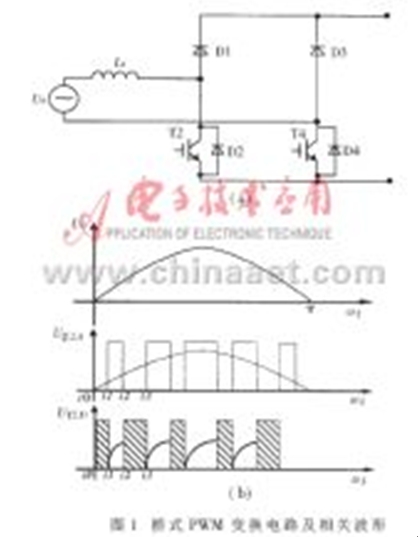 圖1(a)所示為工作在PWM整流狀態(tài)的H型橋式PWM變換電路(此圖為正弦波正半波輸入下的等效電路,上半橋的兩只IGBT未畫出),圖1(b)為下半橋兩只大功率器件的驅(qū)動(dòng)信號(hào)和相關(guān)的器件波形?,F(xiàn)以正半波工作過程為例進(jìn)行分析(對(duì)于三相PWM電路,在整流、逆變工作狀態(tài)或單相DC/DC工作狀態(tài)下,PWM電路的分析過程及結(jié)論基本類似)。