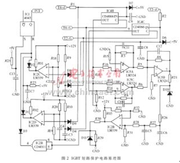 由對(duì)圖1所示電路的分析,可以得到IGBT短路保護(hù)電路的原理電路圖,如圖2所示。在圖2所示電路中, IC4及其外圍器件構(gòu)成選通邏輯電路,由IC5及其外圍器件構(gòu)成濾波及放大電路,IC2及其外圍器件構(gòu)成門限比較電路,IC1及其外圍器件構(gòu)成保持電路。正常情況下,D1、D2、D3的陰極所連接的IC2D、IC2C及CD4011的輸出均為高電平,IC1的輸出狀態(tài)不會(huì)改變。假設(shè)由于某種原因,在給T2發(fā)驅(qū)動(dòng)信號(hào)的時(shí)候,H型橋式PWM變換電路的左半橋下管T2的管壓降異常升高(設(shè)電平值為“高”),即T2-d端電壓異常升高,則該高電平UT2-d通過R2加在D8的陰極;同時(shí),發(fā)給T2的高電平驅(qū)動(dòng)信號(hào)也加在二極管D5的陰極。對(duì)IC2C來說,其反相輸入端為高電平,若該電平值大于同相輸入端的門檻電平值的話,則IC2C輸出為“低”。該“低”電平通過D2加在R-S觸發(fā)器IC1的R輸入端,使其輸出端Q的輸出電平翻轉(zhuǎn),向控制系統(tǒng)發(fā)出IGBT故障報(bào)警信號(hào)。如果是由于右半橋下管T4的管壓降異常升高而引起IC2D輸出為“低”,則該“低”電平通過D1加在R-S觸發(fā)器IC1的R輸入端,使其輸出端Q的輸出電平翻轉(zhuǎn),向控制系統(tǒng)發(fā)出IGBT故障報(bào)警信號(hào)。由IC5A和IC5C及其外圍器件構(gòu)成的濾波及放大電路將選通電路送來的描述IGBT管壓降的電壓信號(hào)進(jìn)行預(yù)處理后,送給由IC5B構(gòu)成的加法器進(jìn)行運(yùn)算處理。若加法器的輸出電平大于由R22和R32確定的門檻電平,則會(huì)使R-S觸發(fā)器IC1的R端的第三個(gè)輸入端為“低”,也向控制系統(tǒng)發(fā)出IGBT故障報(bào)警信號(hào)。改變由R22和R32確定的門檻電平,就可以靈活地改變這第三路報(bào)警信號(hào)所代表的物理意義,從而靈活地設(shè)計(jì)保護(hù)電路。圖2中的端子T4-d、T2-d,分別接在T4、T2的集電極上,T4-G、T2-G分別接IGBT器件T4、T2的驅(qū)動(dòng)信號(hào)。在電路設(shè)計(jì)時(shí)應(yīng)該特別注意的是,D8、D5、D9、D4必須采用快速恢復(fù)二極管。