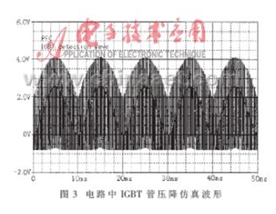 當(dāng)圖1所示的PWM變換器工作在單相高頻整流模式下,應(yīng)用PSPICE仿真軟件對(duì)圖2所示的電路進(jìn)行仿真研究,可以得到如圖3所示的結(jié)果。圖3所示的仿真波形相當(dāng)于在圖2電路中IC5B的第7腳觀察到的信號(hào)波形。仿真結(jié)果表明,檢測(cè)電路可以快速、有效地將PWM變換器的下管導(dǎo)通時(shí)的管壓降檢測(cè)出來。圖4所示波形是實(shí)際電路工作時(shí)檢測(cè)到的相關(guān)波形。圖中,1#通道顯示的是單相高頻整流電感電流的給定波形,2#通道顯示的是實(shí)際檢測(cè)到的圖2電路中IC5B的第7腳的工作波形。比較圖3和圖4可以得出,該檢測(cè)電路可以快速、有效地檢測(cè)出IGBT導(dǎo)通時(shí)的管壓降,從而對(duì)IGBT實(shí)施有效的保護(hù)。