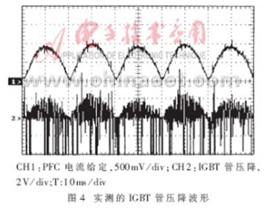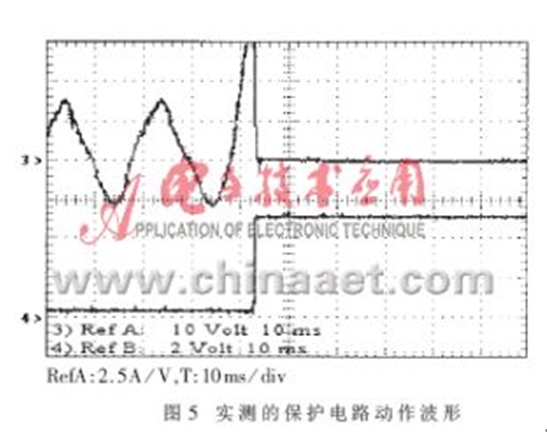 圖5所示為IGBT過流時(shí)實(shí)際檢測(cè)到的PFC電感中流過的電流及保護(hù)電路動(dòng)作的波形。