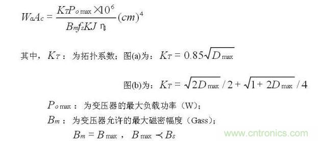 從面積積公式可知,副邊有續(xù)流二極管的變壓器,其拓?fù)湎禂?shù)小一些,如對于Dmax=0.45,KT(a)=0.57,KT(b)=0.58
