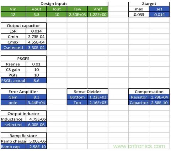 表1所示的電子表格接受綠色的輸入設(shè)計(jì)參數(shù),然后計(jì)算剩余的參數(shù)。