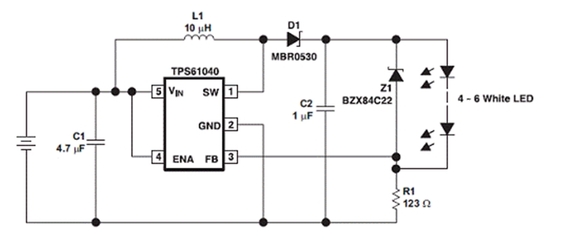 以下電路可生成 101mA 的恒定電流,能為 PDA 和數(shù)碼相機(jī)等便攜式應(yīng)用驅(qū)動(dòng)高達(dá) 6 個(gè)白色 LED">LED。其輸入電壓工作范圍為 1.8 V 至 6 V,可以采用兩節(jié)堿性電池或鎳氫電池輸入(1.8 V 到 ~3 V)、三節(jié)堿性電池或鎳氫電池輸入(2.7 V 到 ~4.8 V)以及單體鋰離子電池輸入(3 V~4.2 V)。這種升壓轉(zhuǎn)換器采用 R1 來(lái)設(shè)置流過(guò) LED">LED 的恒定電流。TPS61040 產(chǎn)品說(shuō)明書(shū) (SLVS413) 給出了本電路的詳細(xì)描述。