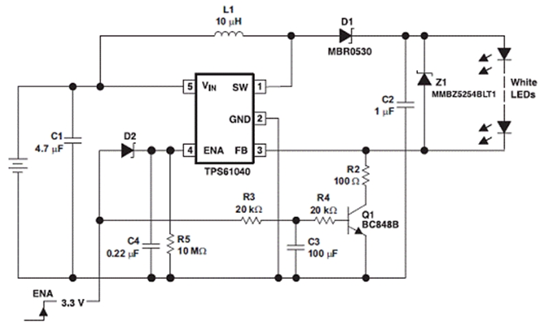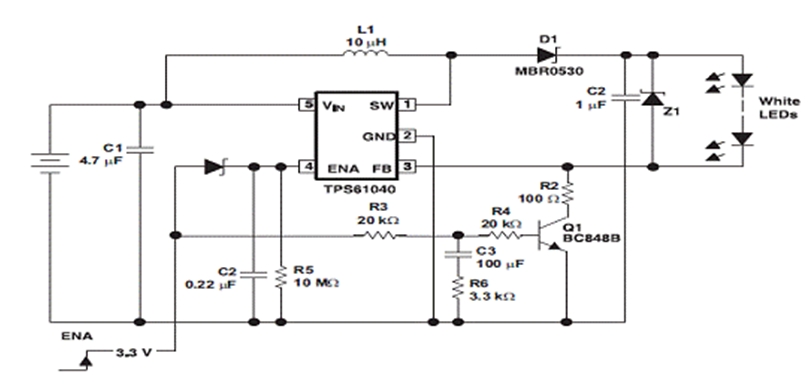 許多采用白光 LED">LED 照明和背光的消費(fèi)類產(chǎn)品都支持開(kāi)關(guān)時(shí)的漸進(jìn)性 LED">LED 發(fā)光變化。這種漸進(jìn)性的發(fā)光變化通常要借助可提供 PWM 發(fā)光變化控制功能的微處理器來(lái)完成。在此,我們將介紹一款采用德州儀器 (TI) TPS61040 白光 LED">LED 驅(qū)動(dòng)器的電路,其在不使用微處理器的情況下同樣也可以實(shí)現(xiàn)開(kāi)關(guān)時(shí)的漸進(jìn)性發(fā)光變化。