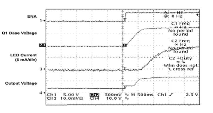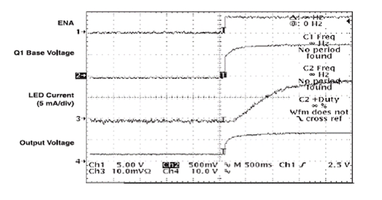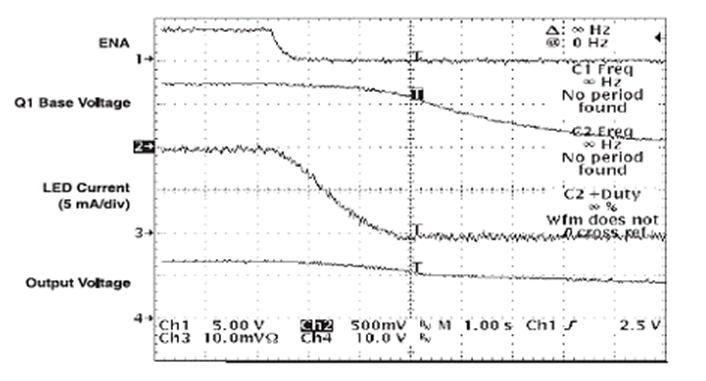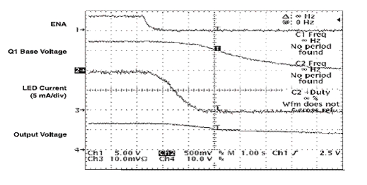 ENA 信號(hào)在電路斷開(kāi)時(shí)下降,此時(shí) D2 會(huì)阻止 C4 放電。TPS61040 保持開(kāi)啟狀態(tài),直到 C4 通過(guò) R5 放電。在 TPS61040 仍為開(kāi)啟狀態(tài)時(shí),C3 開(kāi)始通過(guò) R3 和 R4 放電。隨著 Q1 可用基線電流 (base current) 的下降,Q1 的有效電阻開(kāi)始升高。隨著 FB 引腳上總電阻的升高,LED">LED 電流會(huì)成比例下降。圖 4 顯示了電路斷開(kāi)時(shí)的相關(guān)波形。