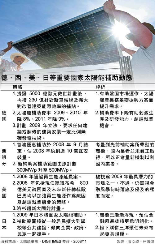 搭配各州政府自己擬定的太陽能補(bǔ)助政策及聯(lián)邦政府延長的太陽能補(bǔ)助案,目前全美有許多州都在擬定這類的太陽光電補(bǔ)助計(jì)劃,其中又以加州最積極;似乎一切都就緒,就等待金融風(fēng)暴落底。