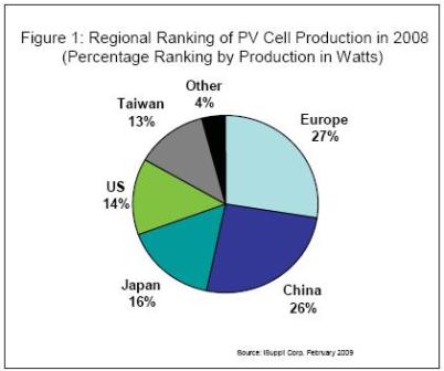 2008年按瓦特數(shù)計算,歐洲企業(yè)占全球PV電池產(chǎn)量的27%,略高于中國的26%,遠高于日本的16%和美國的14%。