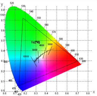 定義您的色域并不簡(jiǎn)單。大多數(shù)LED制造商的規(guī)格數(shù)據(jù)中并沒(méi)有提供其LED的色度坐標(biāo)。不過(guò),當(dāng)您有了色度坐標(biāo)后,就可輕易標(biāo)出LED在色彩空間中的位置,如圖2所示。圖中系統(tǒng)色域的三角形覆蓋在CIE 1931色彩空間的上面。CIE 1931 色彩空間代表人眼能看到的所有顏色;在色彩曲線外的是波長(zhǎng),此數(shù)據(jù)描繪了色度坐標(biāo)。在這個(gè)圖中,加入了普朗克軌跡(Planckian locus),或?yàn)橐粋€(gè)黑體加上顏色,代表黑體在溫度變化時(shí)在色彩空間的坐標(biāo)。以普通詞匯來(lái)說(shuō),這坐標(biāo)代表不同種類的白光通過(guò)CCT之后的結(jié)果。