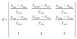 為您的系統(tǒng)設(shè)計(jì)LED控制機(jī)制,面對(duì)的是基本的線性代數(shù)。在得到您LED的色度坐標(biāo)后,您必須先建立一個(gè)矩陣,找出所要色彩點(diǎn)之間的delta值,如公式1所示。公式中色彩下標(biāo)字是LED的顏色,mix下標(biāo)代表您想要呈現(xiàn)的顏色。