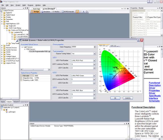 許多色彩系統(tǒng)設(shè)計(jì)擁有不同的回饋方法,需要花數(shù)個(gè)月的時(shí)間來(lái)開(kāi)發(fā)韌體。解決bin的調(diào)整、溫度補(bǔ)償、或更高精準(zhǔn)度的色彩回饋系統(tǒng)以及校正,都需要了解色彩科學(xué)以及精準(zhǔn)的傳感器讀數(shù)。在展開(kāi)任何高亮度LED設(shè)計(jì)時(shí),強(qiáng)烈建議您先了解這些相關(guān)名詞。幸運(yùn)的是,當(dāng)您進(jìn)入市場(chǎng)時(shí),能利用Cypress Semiconductor所提供快速且輕易的PSoC Express 3.0解決方案,協(xié)助您快速展開(kāi)研發(fā)。所有這些不同的回饋解決方案,以及高亮度LED的補(bǔ)償機(jī)制,都收錄在一個(gè)簡(jiǎn)單易用的圖形化接口,讓您僅須使用下拉式選單以及各種校正技巧,就能完成這些設(shè)計(jì)。