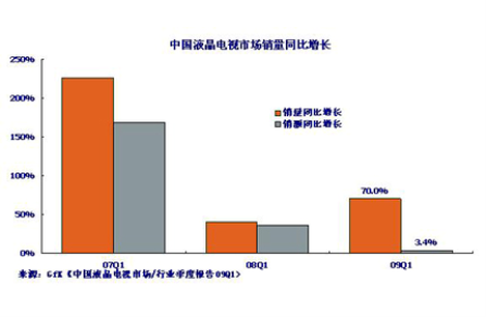 GfK中國發(fā)布的《液晶電視產(chǎn)業(yè)市場季度報告(09Q1)》顯示:2009年1季度,中國液晶電視市場出現(xiàn)了反彈,銷量達到476萬臺,比2008年1季度增長了約70%。
