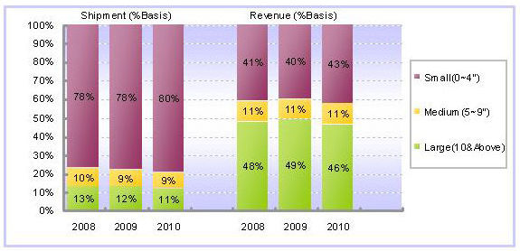 再從出貨尺寸別來看,主要觸控面板的出貨尺寸集中在4寸以下(含4寸),2008年出貨量為3億6,000萬片,占整體市場比重將近79%。同樣地,受到全球經(jīng)濟衰退的影響,2009年在4寸以下(含4寸)的出貨量雖然目前看來將維持與2008年相仿的水準(zhǔn),但到了2010年預(yù)計將會有2%的成長幅度。
