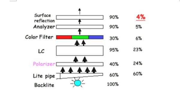 [page]首先,這種方法省去了彩色濾色片,而濾色片是光能的主要吸收者,它會損失光能70%以上。圖2表明了光能從光源出發(fā)以后所受到的損失。