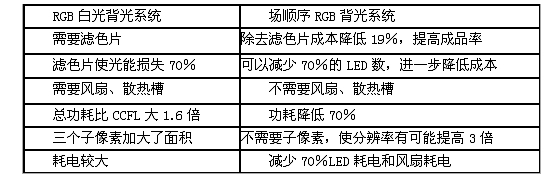 過去都是采用白色LED作為背光,為得到更好的色域表現(xiàn)能力,改為采用RGB三色的LED來混合成白色,但是這樣做需要更多的LED。而且由于本來就需要顯示彩色,完全沒有必要先將RGB的彩色混成白色,再用RGB濾色片濾出彩色。為此三星公司推出了一種無濾色片的場順序RGBLED背光技術。