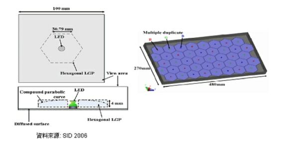 在2006年SID會議上,臺灣交通大學提出了一種整體上是直下式,而單個來看卻是采用側射式的LED,從而提高了其光線利用率,減少了所需LED數(shù)目并提高了效率。這種技術主要是采用側射式LED搭配以六角形導光單元.