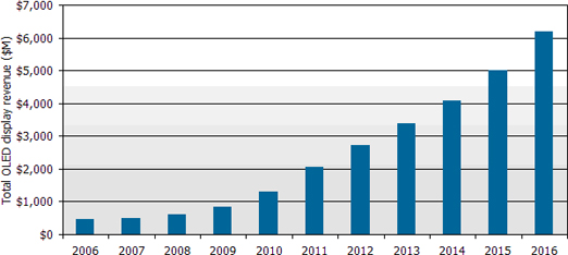根據(jù)DisplaySearch最新發(fā)表季度OLED(有機(jī)發(fā)光二極管顯示器)出貨報(bào)告指出,第二季全球OLED出貨金額創(chuàng)新高達(dá)1億9千2百萬(wàn)美元,較上一季成長(zhǎng)32%,與去年同期相比成長(zhǎng)22%。DisplaySearch預(yù)測(cè)全球OLED產(chǎn)值將從2008年6億美元,按每年33%復(fù)合成長(zhǎng)率成長(zhǎng),估計(jì)到了2016年整體產(chǎn)值將達(dá)到62億美元;其中手機(jī)主屏仍是最主要的應(yīng)用,2016年出貨金額估計(jì)為30億美元,同時(shí)OLED TV產(chǎn)值將達(dá)20億美元,成為OLED第二大應(yīng)用產(chǎn)品。