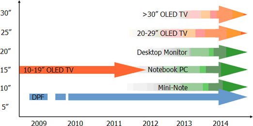 隨著技術(shù)進(jìn)步,DisplaySearch預(yù)估AMOLED將進(jìn)一步朝中大尺寸方向發(fā)展。筆記本計(jì)算機(jī)將是AMOLED廠(chǎng)商下一個(gè)關(guān)注的應(yīng)用方向,我們估計(jì)自2010年年中,廠(chǎng)商將有機(jī)會(huì)將AMOLED應(yīng)用在筆記本計(jì)算機(jī)上,而采用AMOLED面板上網(wǎng)本將有機(jī)會(huì)于2010年底開(kāi)始量產(chǎn)。在TV方面,我們預(yù)期2010年底將會(huì)有大于20寸AMOLED TV被生產(chǎn),同時(shí)預(yù)期2011年大于30寸AMOLED TV 將會(huì)進(jìn)入市場(chǎng)中。