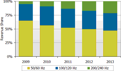 圖一 2009~2013 全球30寸及以上尺寸液晶電視按不同倍頻技術(shù)出貨金額比率